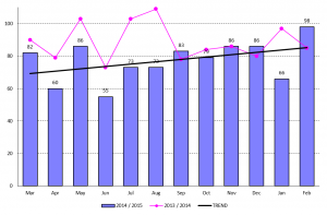 With sales rising to 98 in February this exceeds the ten year average sales volume of 97 (which 20% higher than the current average). Overall sales during the past year are sitting 13% less than the previous year at an average of 77 sales per month.